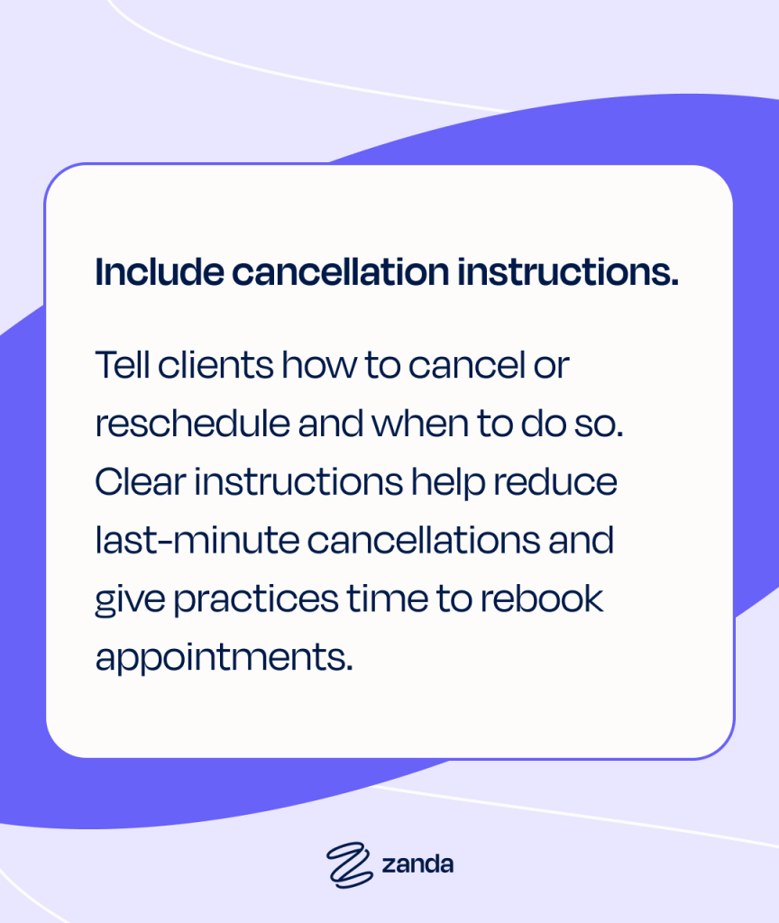 Tell clients how to cancel or reschedule and when to do so. Clear instructions help reduce last-minute cancellations and give practices time to rebook appointments.