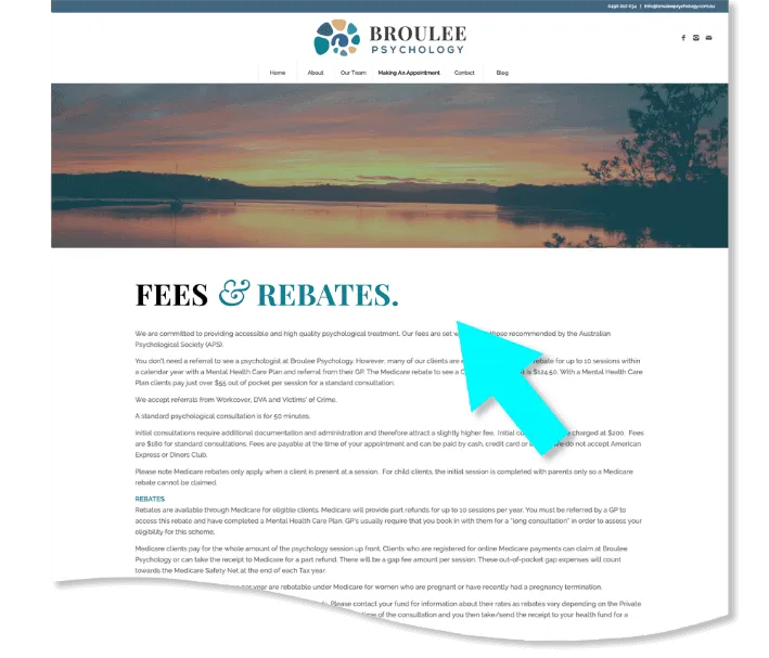 On Broulee Psychology’s website there is a Fees and Rebates page which can be accessed from the main navigation menu. The page clearly outlines the fee structure, rebates and what clients will need to pay.