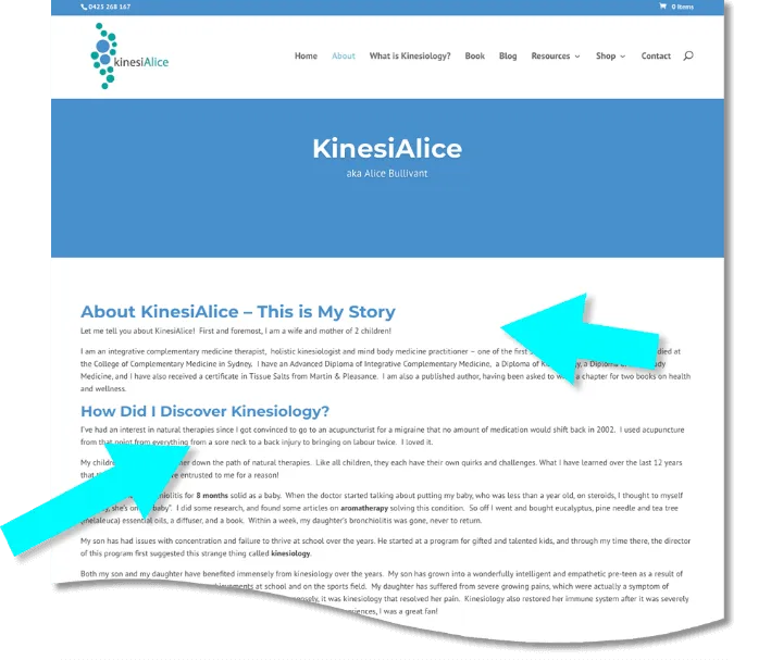 KinesiAlice has a very personal About Us page that shares some of her journey and encourages trust as she shares her qualifications and contributions that she has made to Kinesiology.