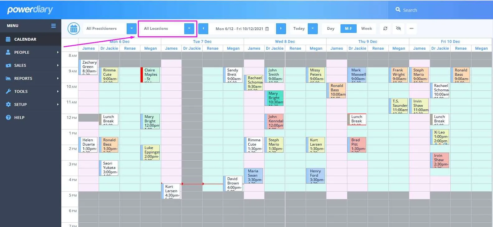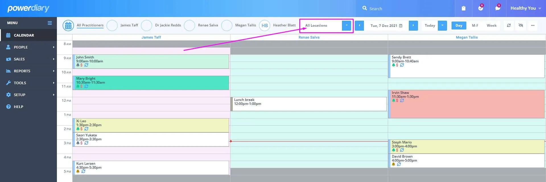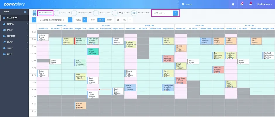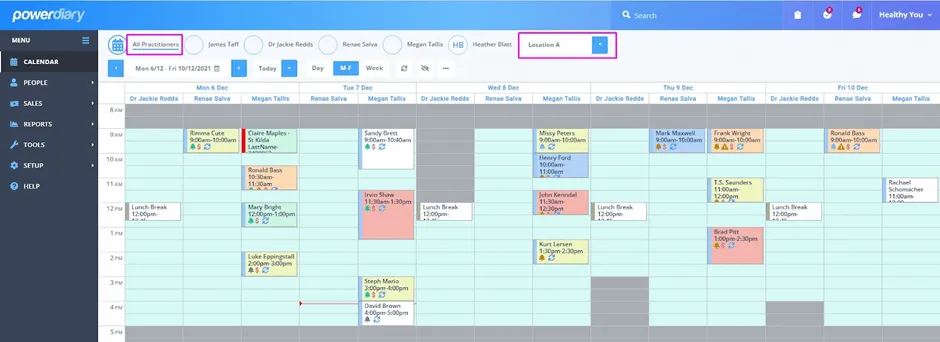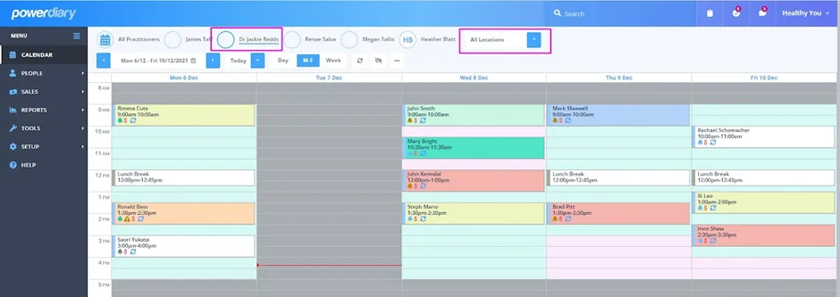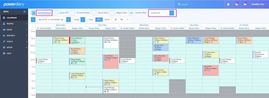 This is a big one for multi-location practices! The Locations Filter is a handy tool that allows you to easily view practitioner appointments for a specific location or all locations.