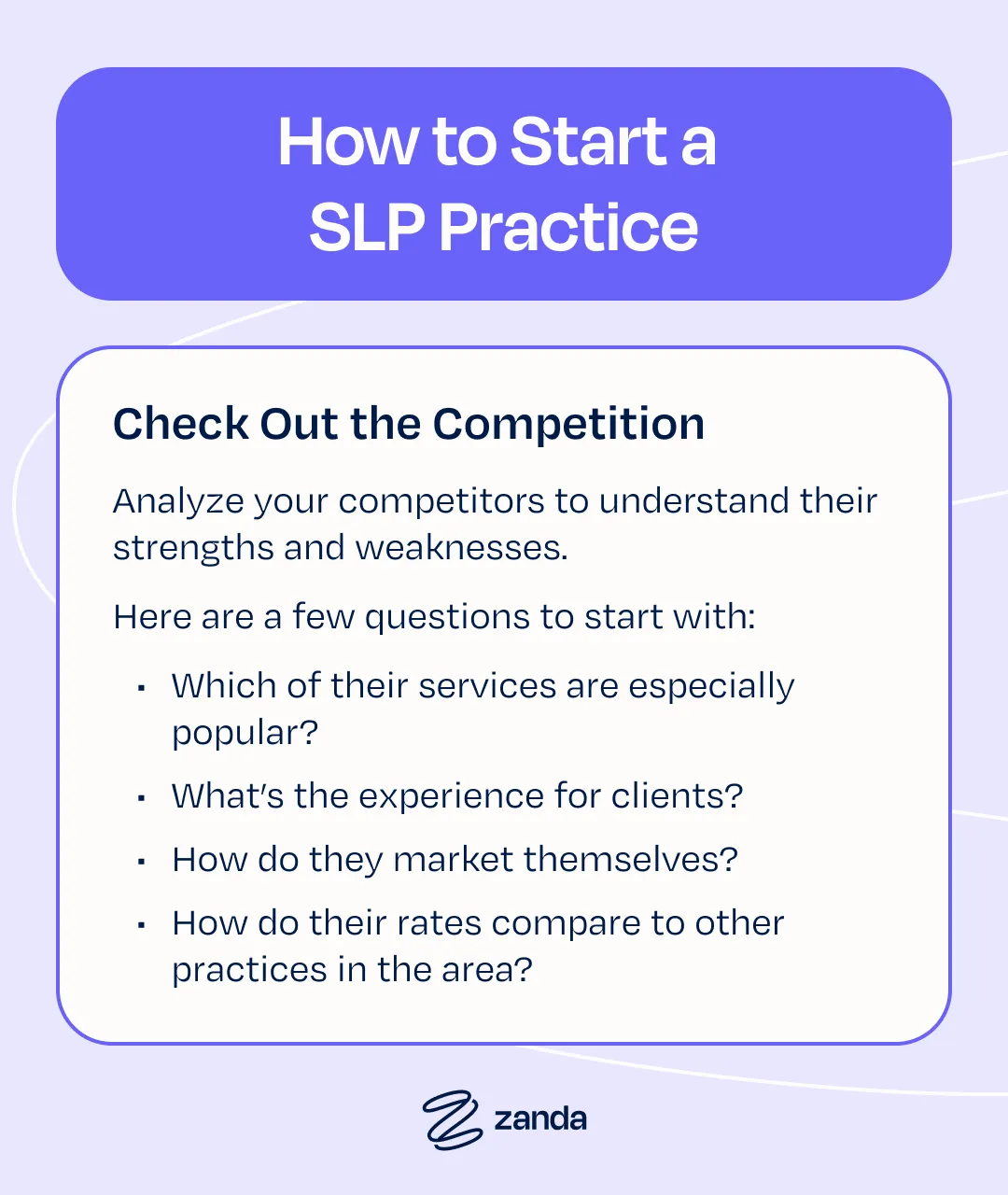 What sets your practice apart? Whether you specialize in pediatric therapy, working with stroke patients, or focusing on voice disorders, identify something unique about what your practice will offer.