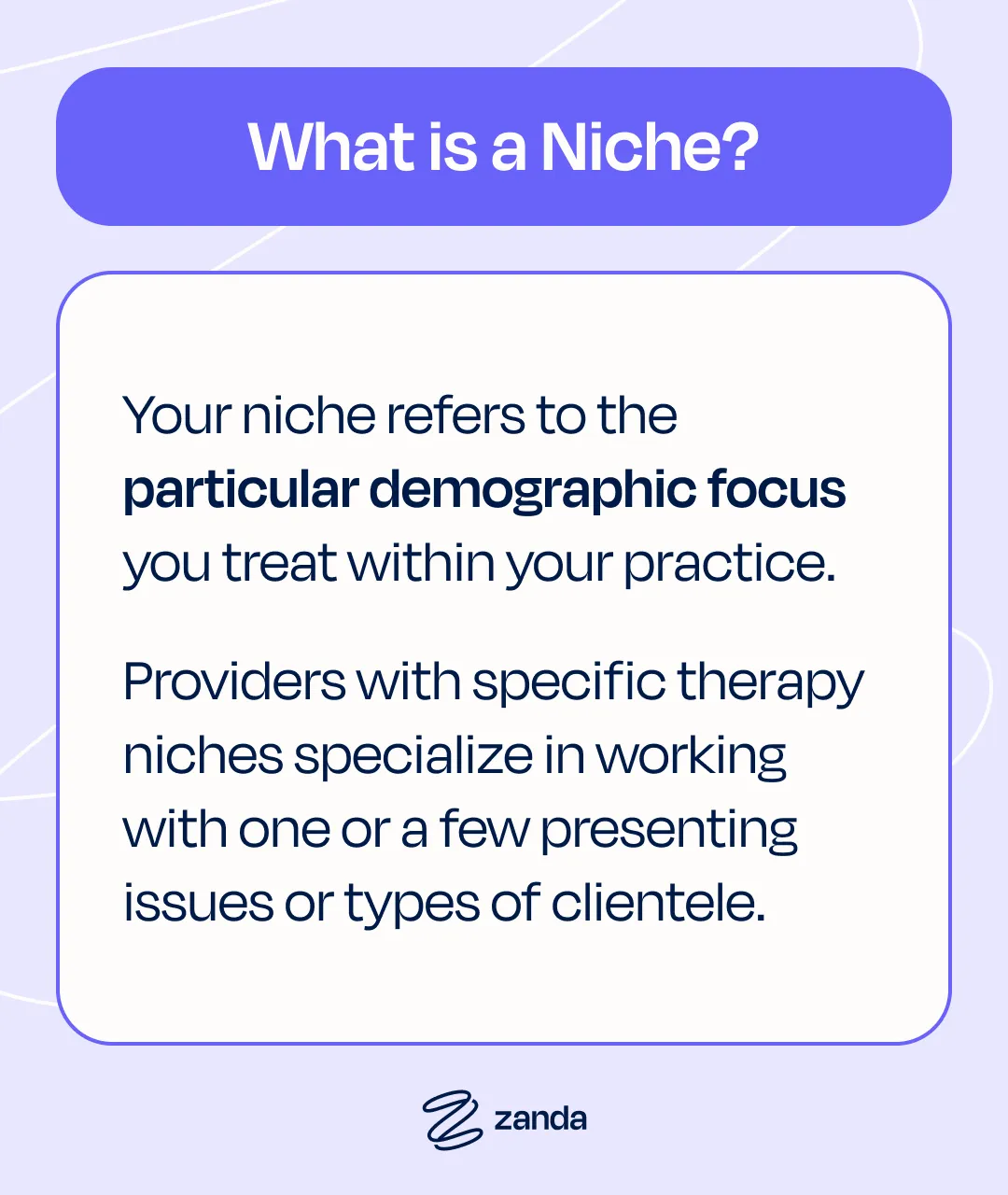 Your niche refers to the particular demographic focus you treat within your practice. Providers with specific therapy niches specialize in working with one or a few presenting issues or types of clientele.