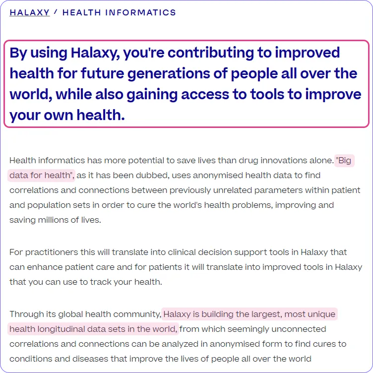 Halaxy advises users they “are building the largest, most unique health longitudinal datasets in the world” and that by using Halaxy, they’re “contributing” in exchange for “access” to the system.