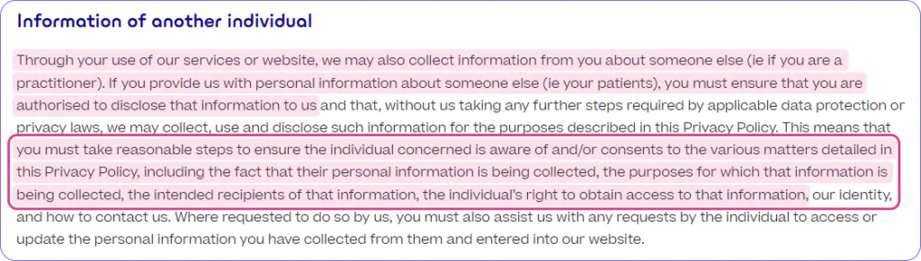 “…you must take reasonable steps to ensure the individual concerned is aware of and/or consents to the various matters detailed in this Privacy Policy…”
