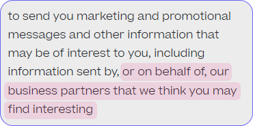 - “to send you marketing and promotional messages…sent by…our business partners…”.