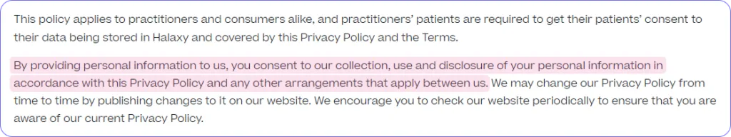 The Halaxy Privacy Policy starts out with a fairly standard introduction, and reinforces the notion that by providing personal information, you consent to Halaxy using it in the manner described in that policy. This is all pretty standard.